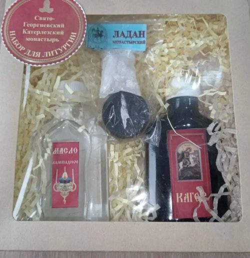 Набор для литургии. Состав: Кагор 200 мл, масло лампадное 50 мл, уголь кадильный — 1 шт, ладан кадильный 1 упаковка.